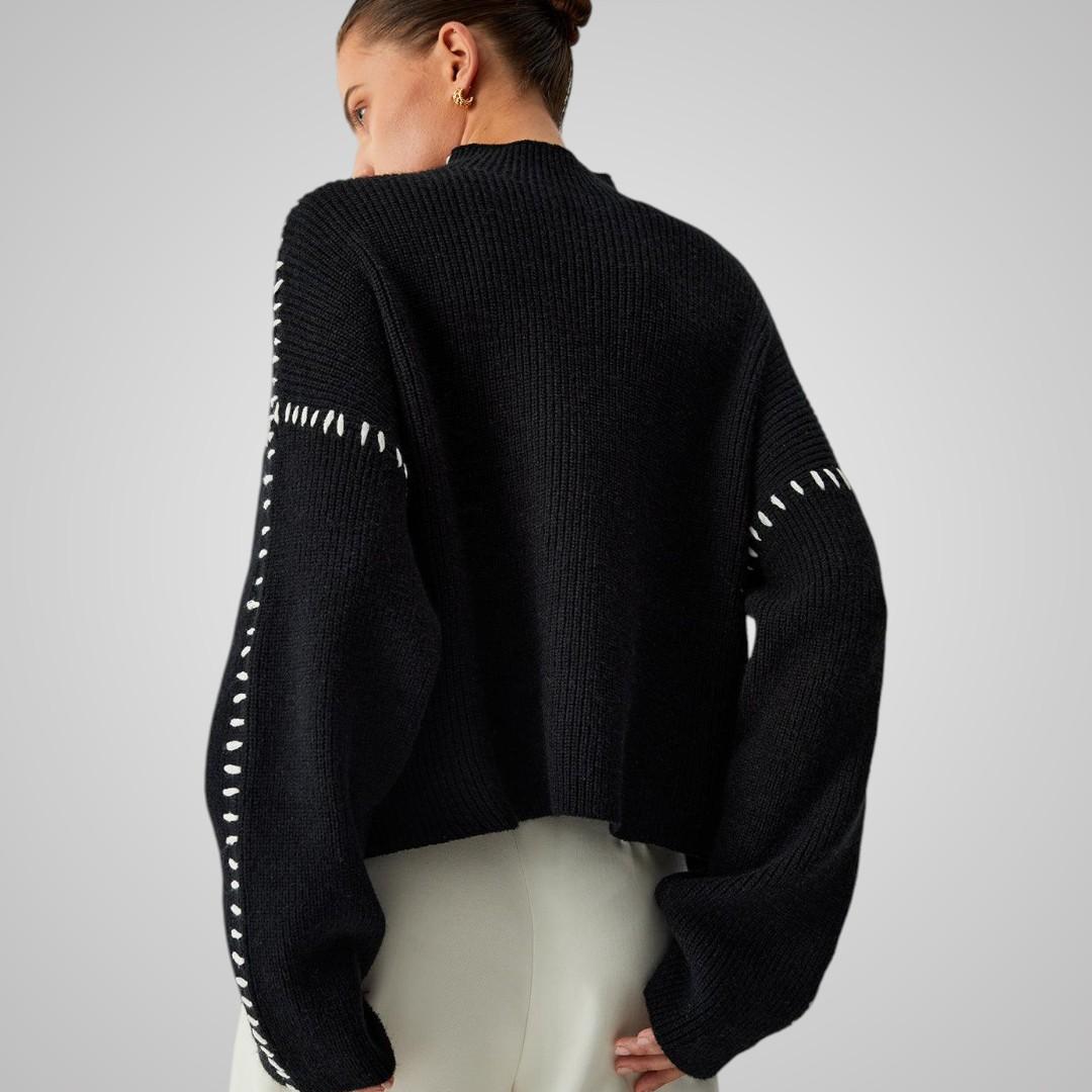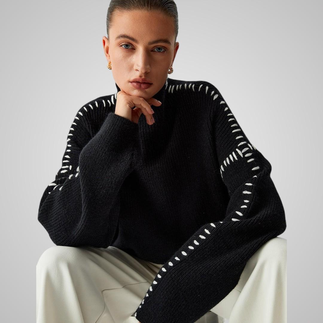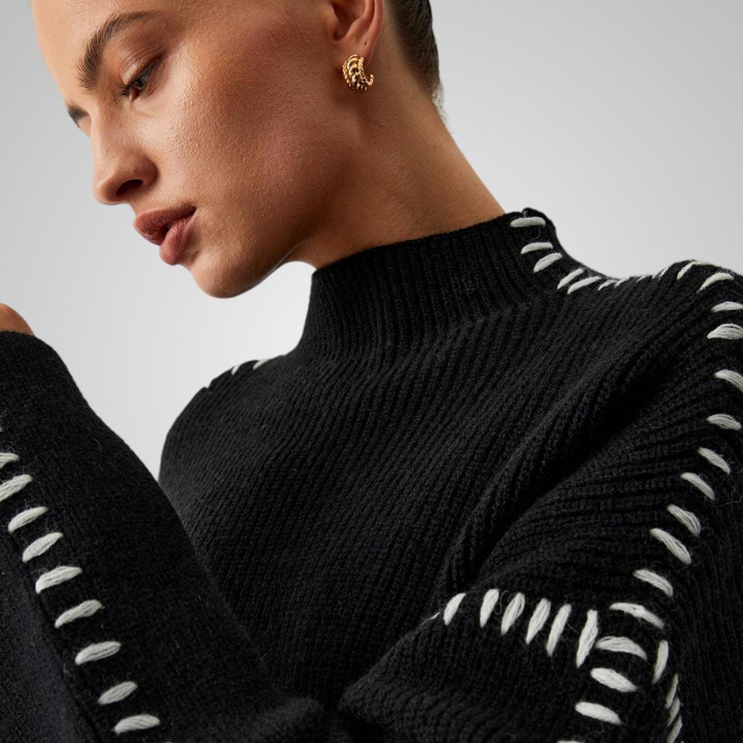 Vill du ha något varmt som ändå sticker ut? Elvira är tröjan som drar blickarna till sig utan att kännas för mycket. Den svarta basen med kontrastsömmar längs ärmarna skapar en trendig look du kan bära både till jobbet och på helgen. Ett stilval som känns genomtänkt.